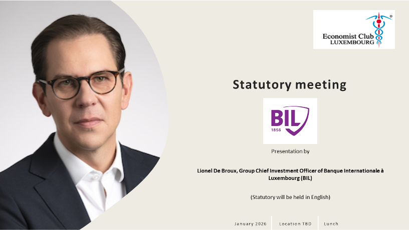 Dear Members of the Economist Club Luxembourg, Dear Friends, The Economist Club Luxembourg is pleased to invite you to its next statutory meeting, featuring Lionel De Broux, Economic Outlook 2026.…
